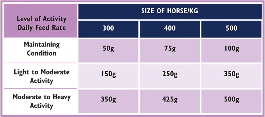 - To be used with a hard feed or balancer: 40-120g per 100kg liveweight depending on activity and hard feed levels.