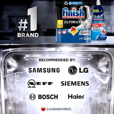 Finish Ultimate dishwasher tablets, provides ultimate clean on your dishes and glasses, 1st time every time.