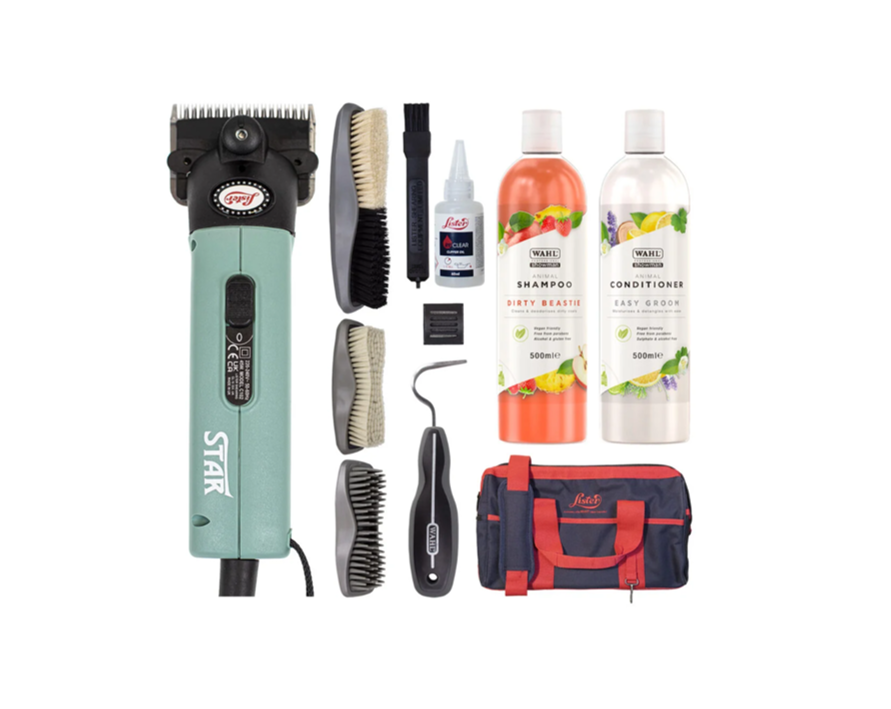 This is an amazing bundle at a great value! The Lister Star Clipper is powerful, fast and efficient and is ideal for professionals and enthusiasts alike. The Lister Star excels at full body clipping and is the ultimate tool for anyone planning on clipping their horse. This Promo Bundle version comes with Three Brushes - Face, Body & Curry Brush, Shampoo, Conditioner, a Hoof Pick, Oil & Cleaning Brush & an extremely handy Holdall Bag to keep all your bits safe and together.