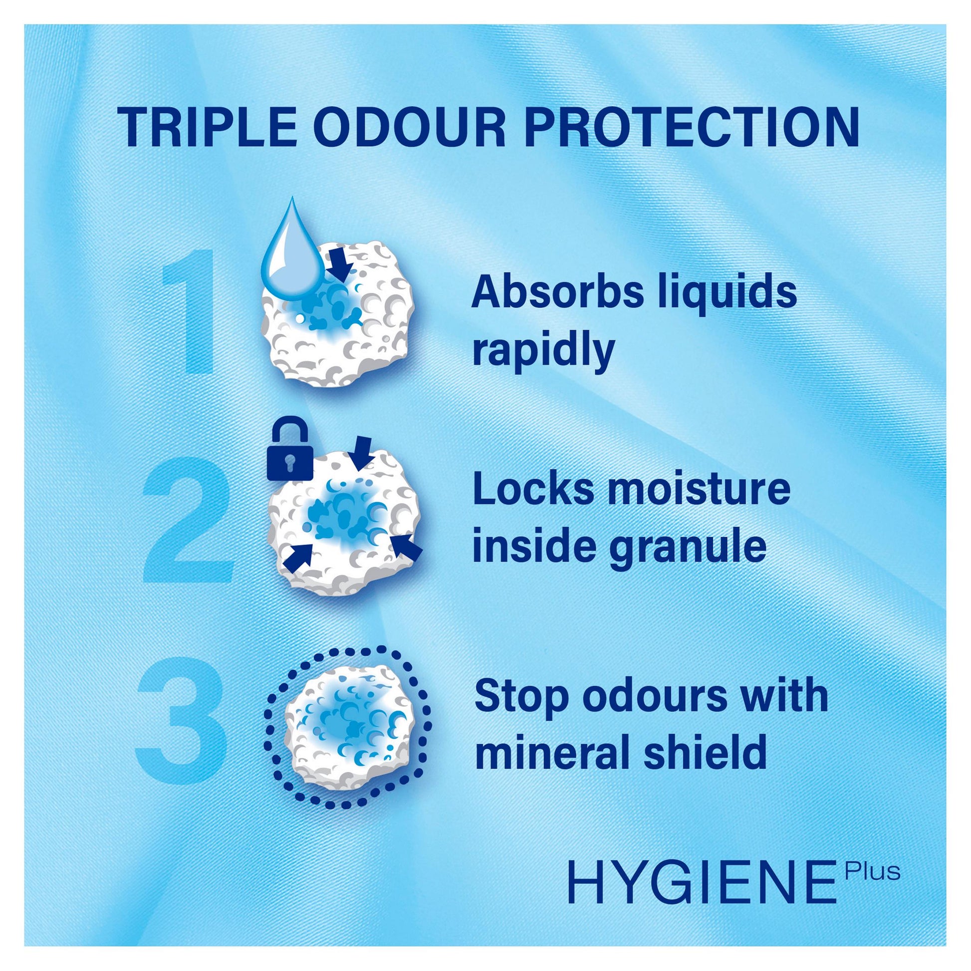 The unique mineral protection of each granule of hygienic cat litter ensures reliable, lasting odour control without added fragrances, giving Catsan Hygiene Plus its high efficiency and durability